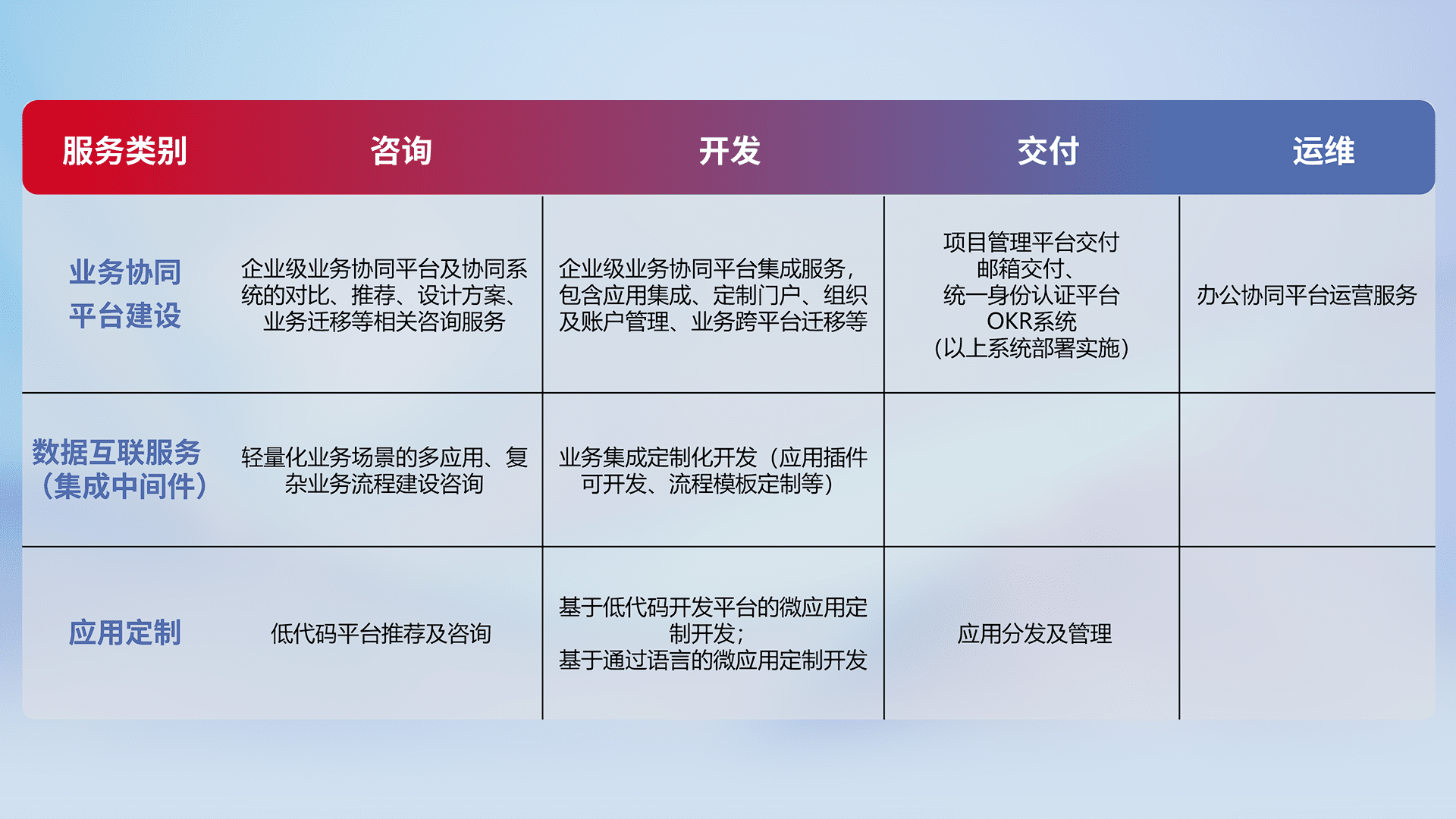 针对钉钉、、企微、、、、IDaas等平台级产品提供产品的规划、、、方案、、、交付、、、、定制化开发等服务,,实现如统一协同办公、、、、智能客户服务、、混合会议管理、、智能数据查询、、、等业务场景,,,,实现数字化转型。。。