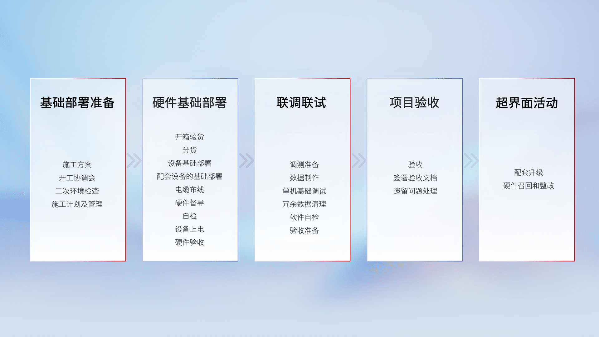 从基础部署准备、、、硬件基础部署、、、联调联试、、项目验收、、、、越界面活动的全过程可追溯,,,,保证施工质量和进度。。。。