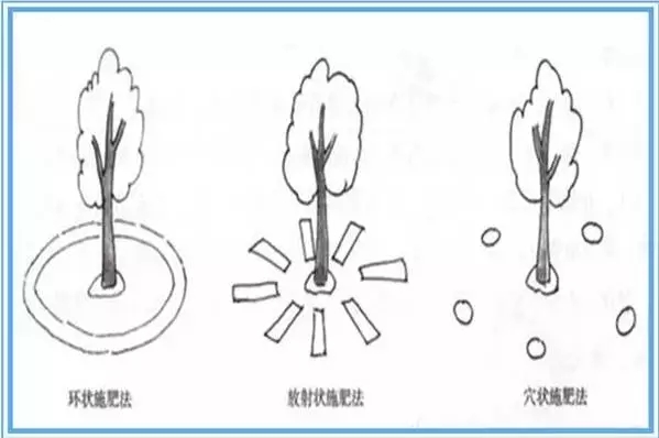 ②放射状施肥法:在树冠投影内外各40厘米左右,沿水平根生长方向 ,挖放射沟6-8条,沟宽30厘米,深20-40厘米,形状是“内窄外宽、内浅外深” ,肥料与土壤混合施入,此法多用于成年树。
